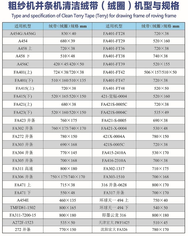 我公司降重推出第九代新型高科技納米材料,粗紗機、并條機清潔絨帶(絨),真正做到了無靜電、抗靜電、無熒光、永不拉長、四條絨帶在清潔器上運轉平穩(wěn)一致,而且不起棉結、清花效果比羊毛(白呢)和尼龍絨毛植絨帶提高了2倍,清花效果中有利的把附著在膠輥和羅拉上的短絨、飛花、雜質清掉,使粗紗干條大大減少了游羽、圈羽現(xiàn)象,永不拉長節(jié)約了停機次數,為粗紗車間每年節(jié)省用工17-21個工期,提高了效率,為紡織廠節(jié)省了開支。從前的絨帶全部有熒光,第九代絨帶真正做到了無熒光,在現(xiàn)代紡紗中,提倡紗線的綠色健康熒光實際就是化工化學產品而造成的,我們采用意大利進口白棕樹棕毛,經過12道工序制作當前絨化,又開發(fā)了先進的植絨機器,讓絨毛和底布結合的更牢固,如果絨帶上有熒光,就造成了絨帶和羅毛,拉摩擦產生靜電、起棉結現(xiàn)象,棉結落到粗紗干上,造成了很大的瑕疵,還有棉紗上有熒光,大大影響了染色有瑕疵、有異纖。新型高科技納米材料絨帶,它降低紗疵、提高成紗質量,從而達到******高立,提高產品******化。
